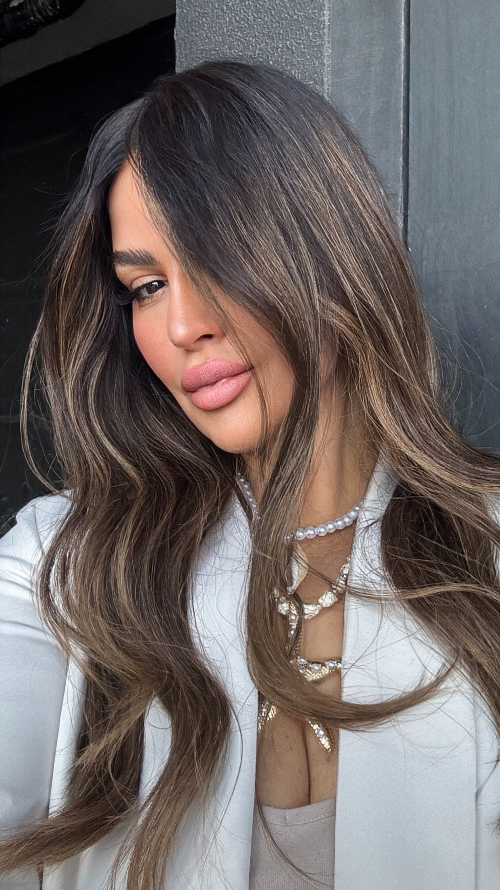 Colour dark cool root melting into an espresso brunette base with caramel & toffee highlights